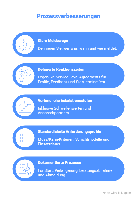 Dazu kommt ein operatives Problem, das selten offen ausgesprochen wird: Je mehr Dienstleister parallel eingebunden sind, desto mehr Zeit geht in Abstimmung, Nachverfolgung, Dokumentation und Eskalation verloren. Am Ende wird Personal zwar „organisiert“, aber nicht wirklich gesteuert.