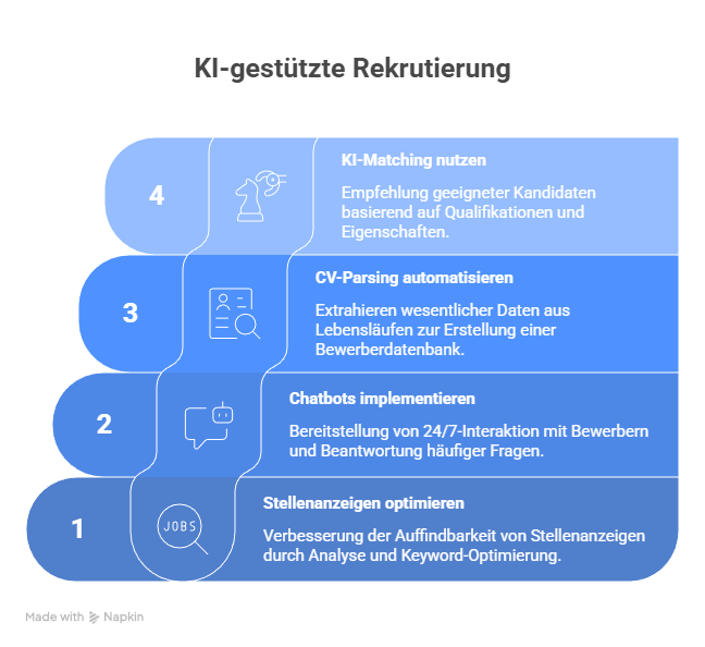 | Typische Einsatzfelder | Häufige Anwendungsfälle sind Stellenanzeigen-Optimierung, Chatbots für Erstkontakt, CV-Parsing zur Strukturierung von Profilen und Matching zur Rangfolge passender Kandidatinnen und Kandidaten. |